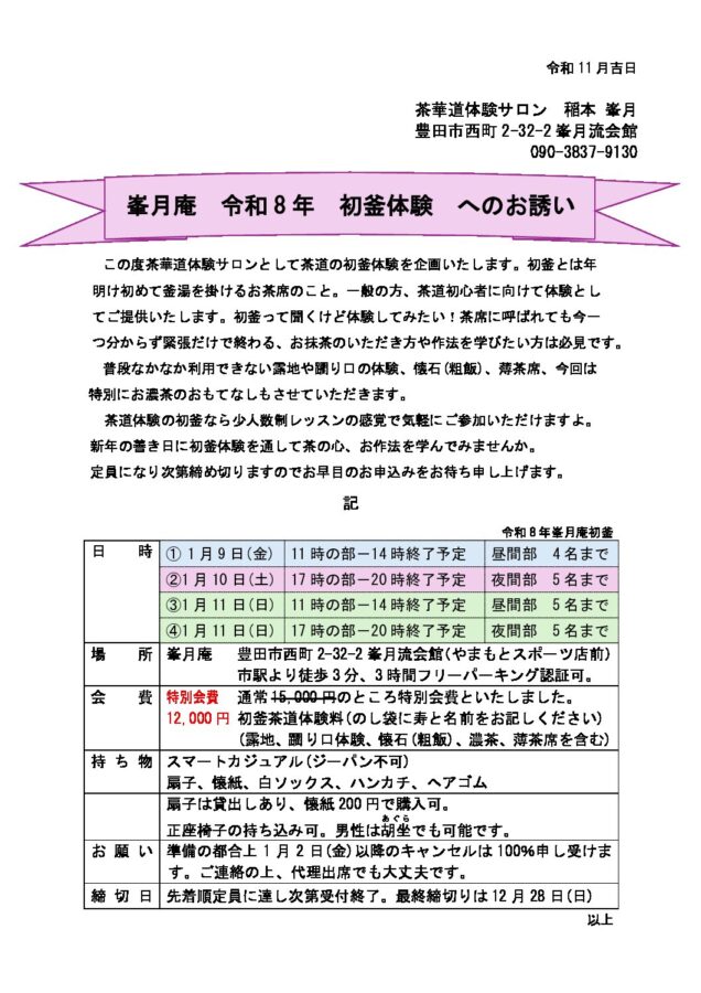 10日(土)10th(Sat)17:00~20:00初釜 Hatugama ※上記お日にちの体験レッスン時間枠でご予約がお取りできます。 |